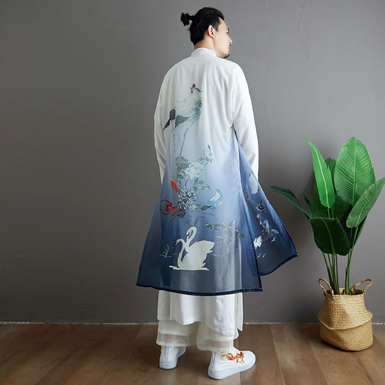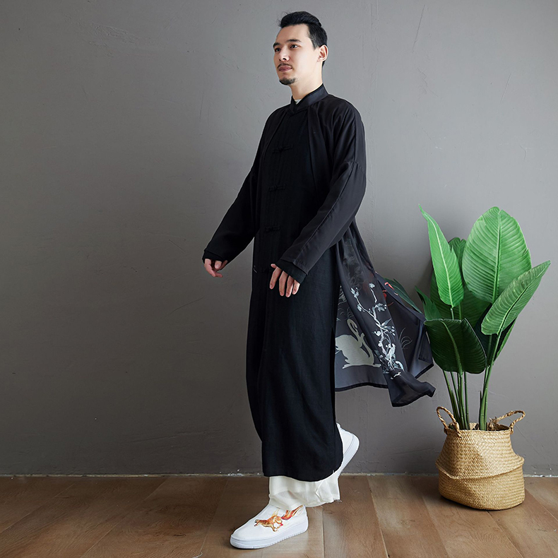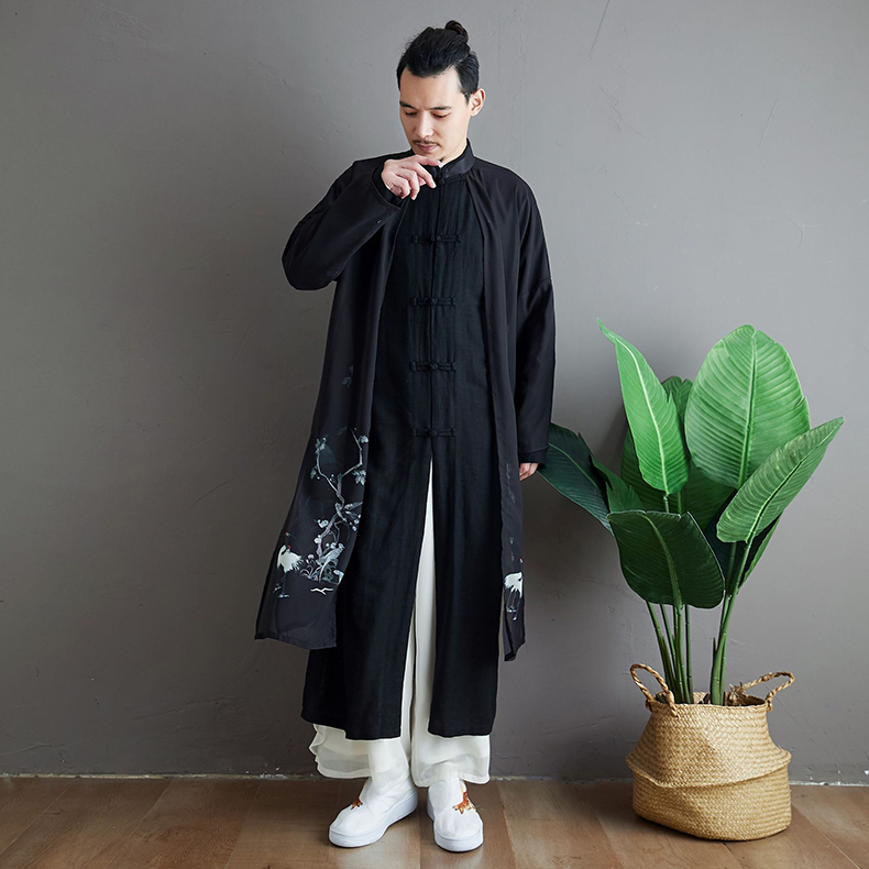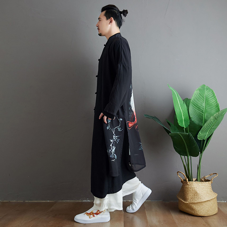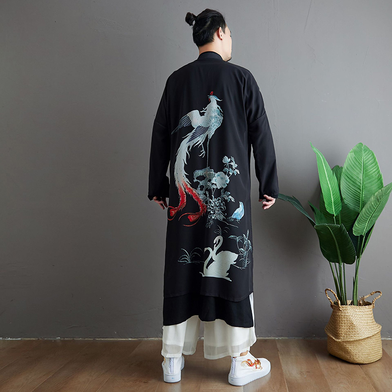 Unique ethnic style pattern design,open front,loose fit, printed pattern.Mandarin collar design coat, frog buttons closure, fake two piece,chinese style trench coat with phoenix pattern printed, slim fit, all designs show man elegant charm.